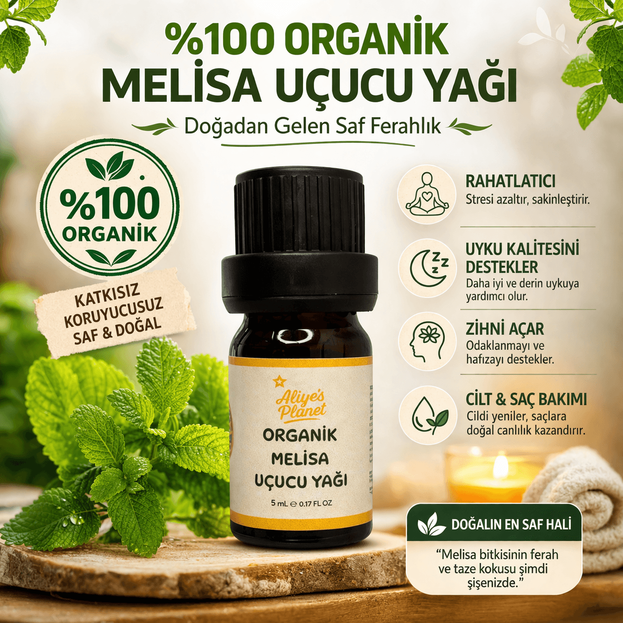 %100 Organik Melisa Uçucu Yağı – Cilt Bakımı, Aromaterapi, Stres Azaltıcı & Uyku Destekleyici
