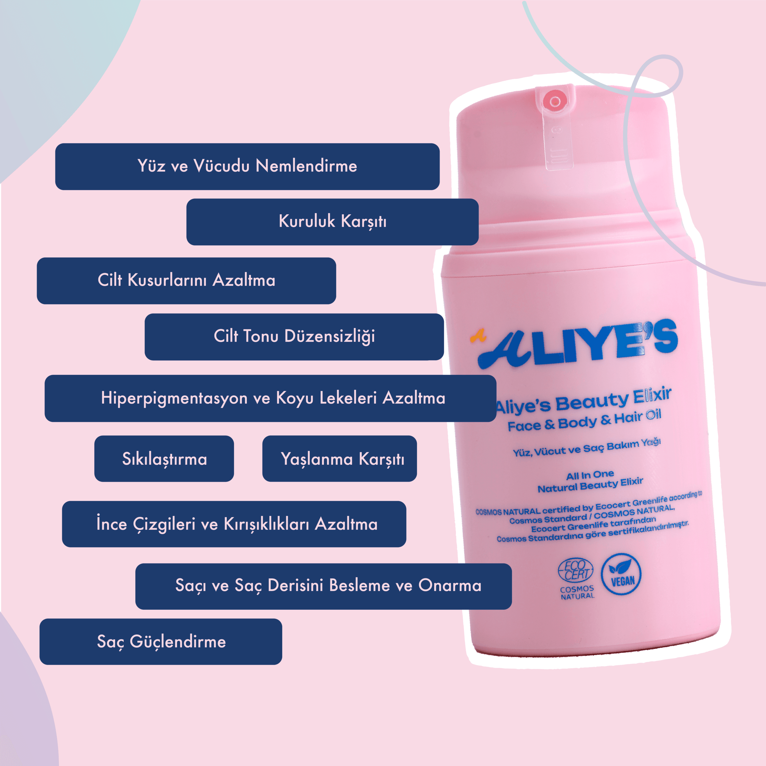 A Aliye’s Beauty Elixir, cilt kusurlarının görünümünü gözle görülür şekilde azaltır ve cilt tonu eşitsizliğini gidermeye yardımcı olur. Gece uygulandığında ertesi sabah cildiniz onarmaya, ayrıca dinlenmiş, canlı ve parlak görünmesine yardımcı olur.