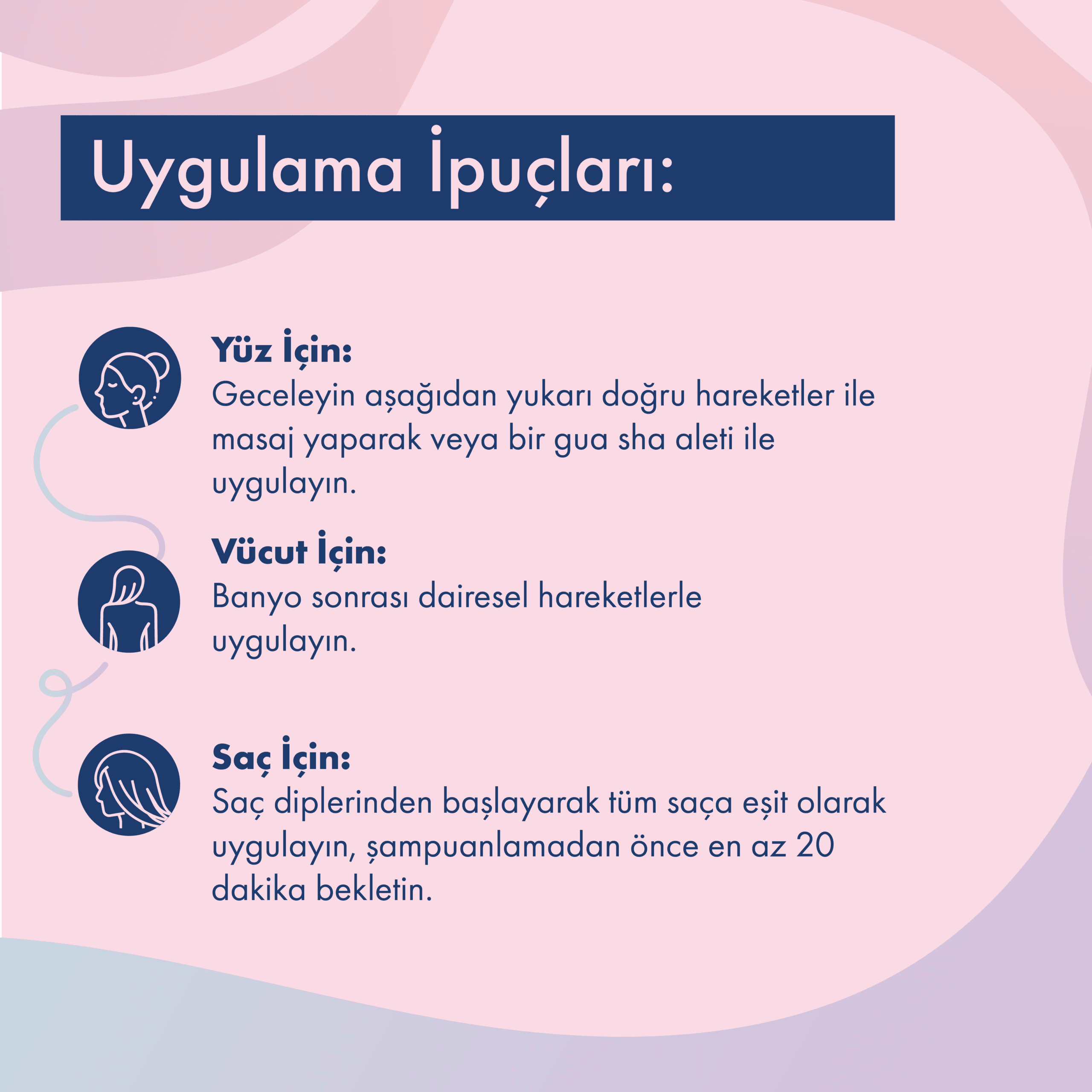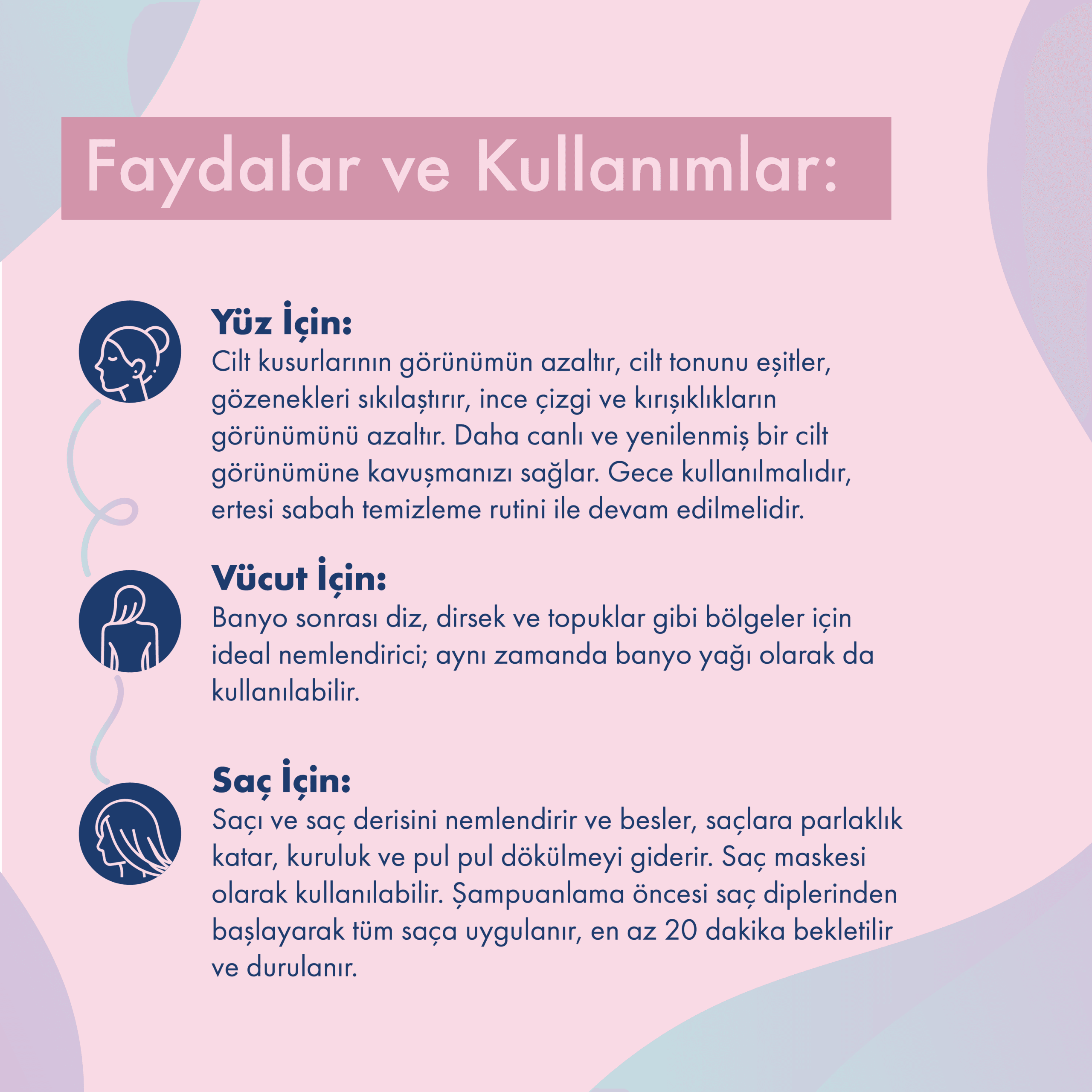 Saçlarınızın ipeksi bir parlaklık kazanmasına yardımcı olur. Saç derinizde kuruluk ve kabuklanma sorununuz var ise saç derinizi nemlendirerek kuruluğun giderilmesine yardımcı olur.